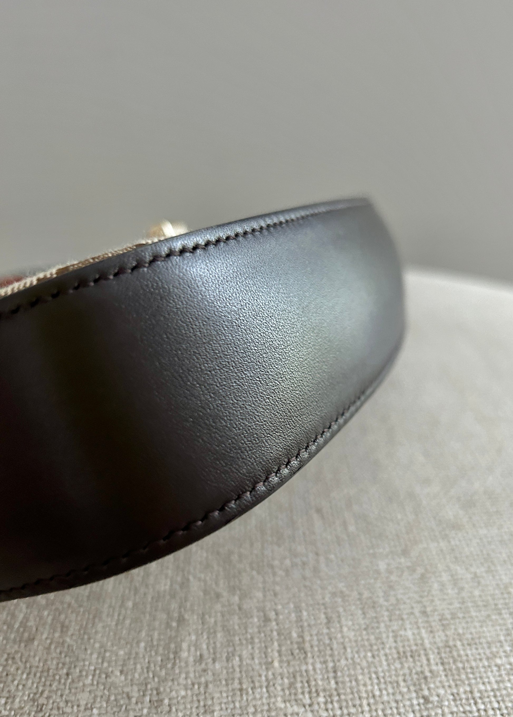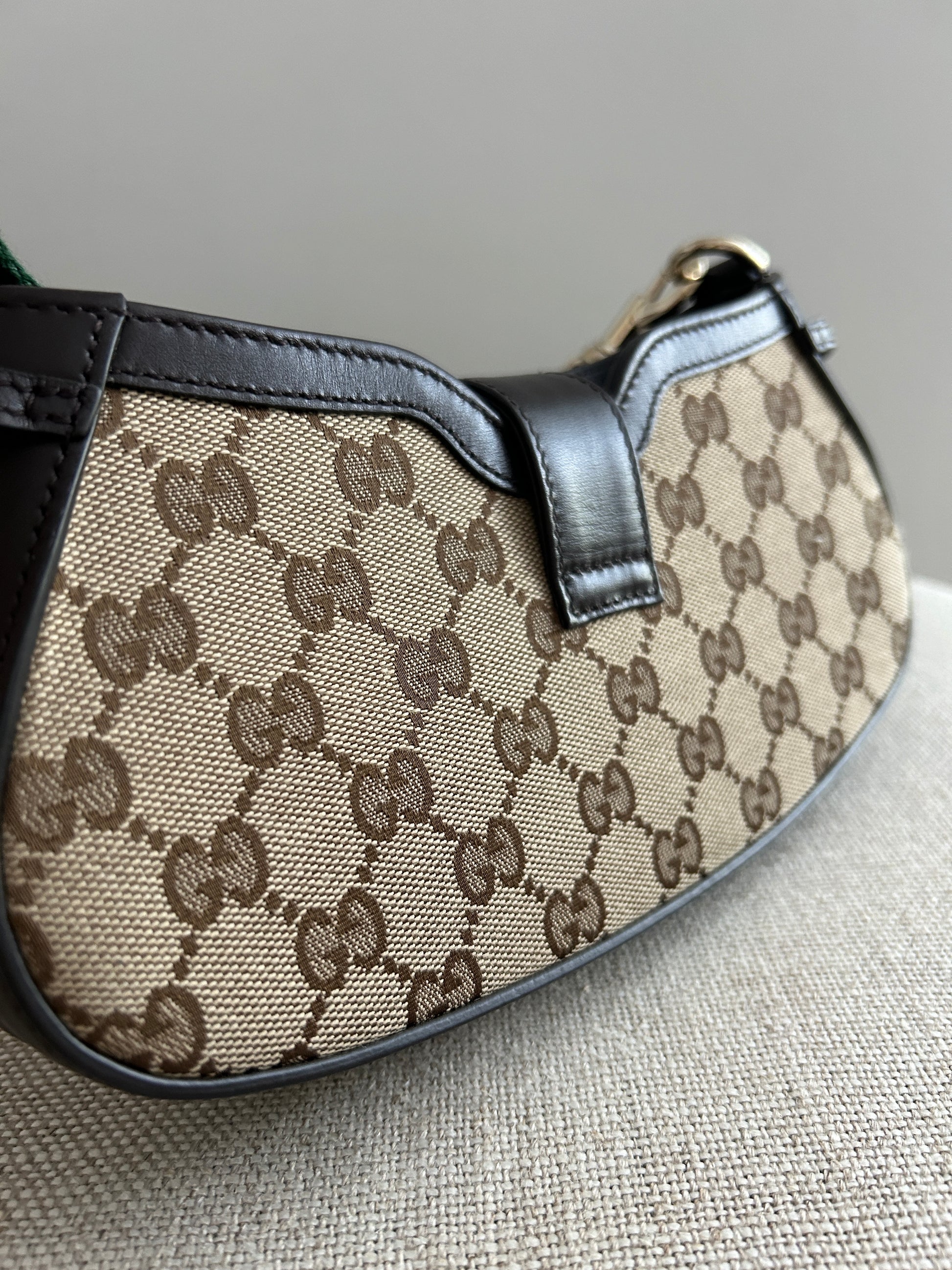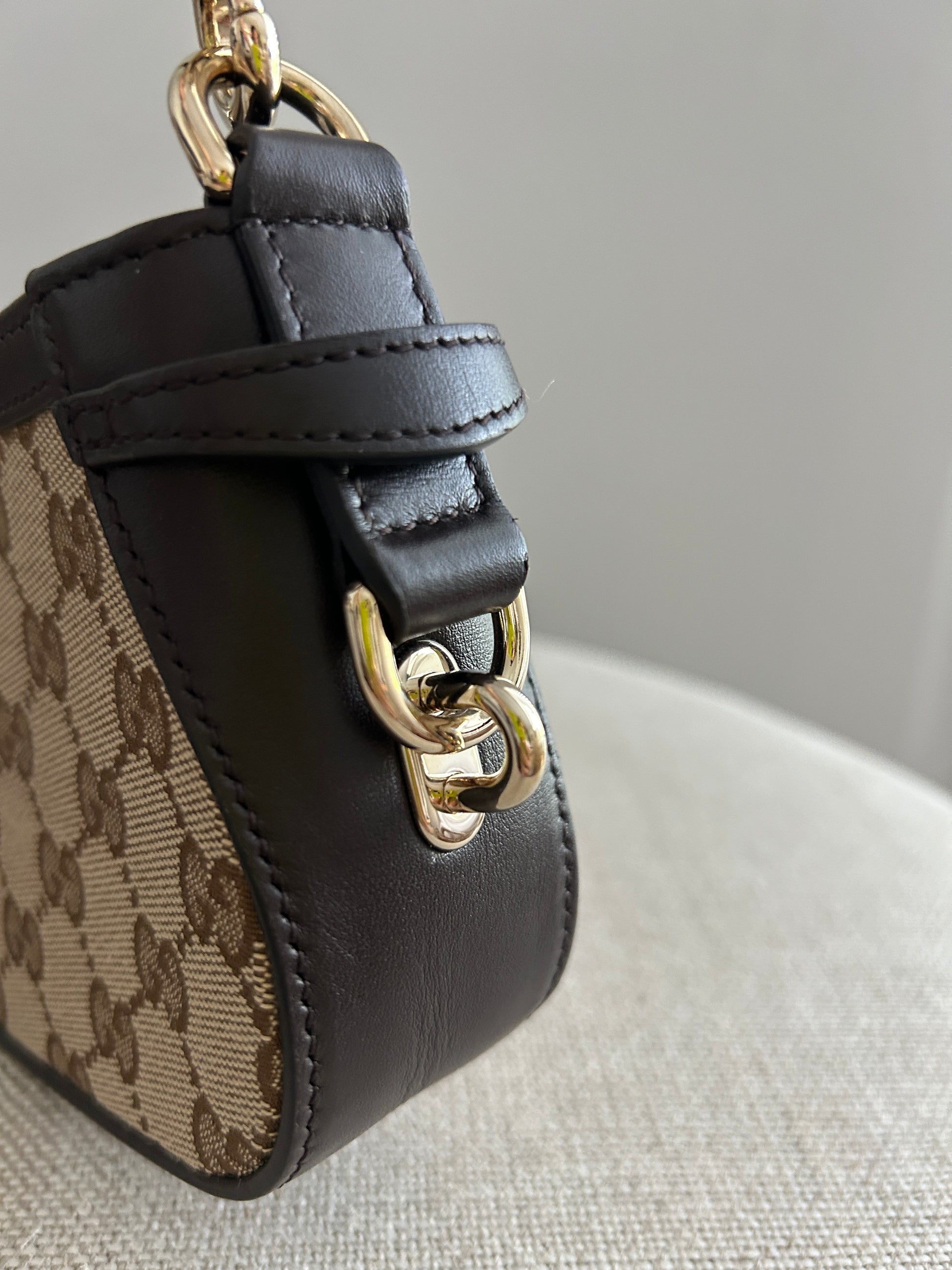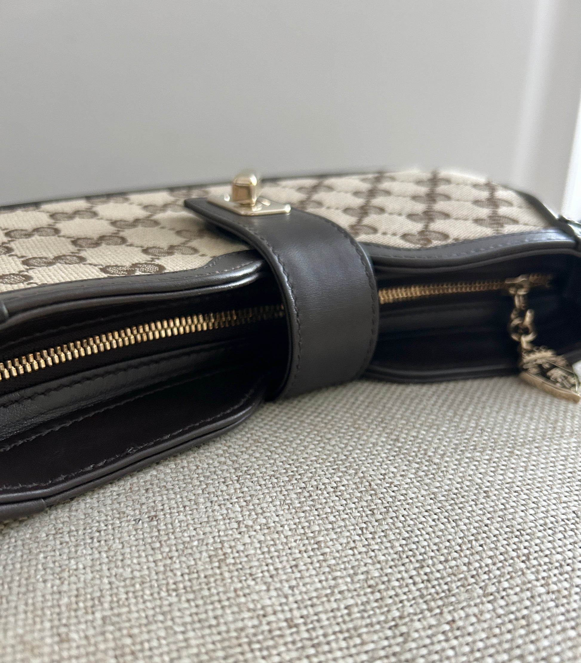 In a beige and ebony Original GG canvas with light gold-toned hardware. The green and red stripe Web is attached through a leather loop and hardware ring on the sides which give the bag additional function and structure.